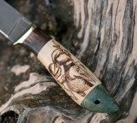 Нож Белка из булатной стали, рукоять - стабилизированная карельская береза, кожаный чехол идет в комплекте.
