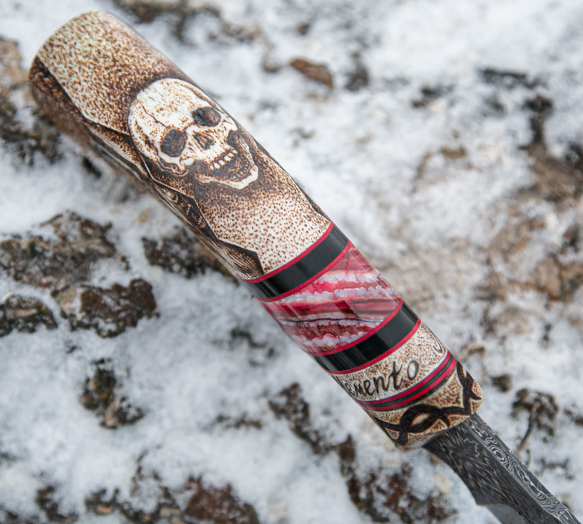 Нож Гефест из мозаичной дамасской стали, рукоять - рог лося (выжигание на кости), вставка - зуб мамонта, кожаный чехол идет в комплекте